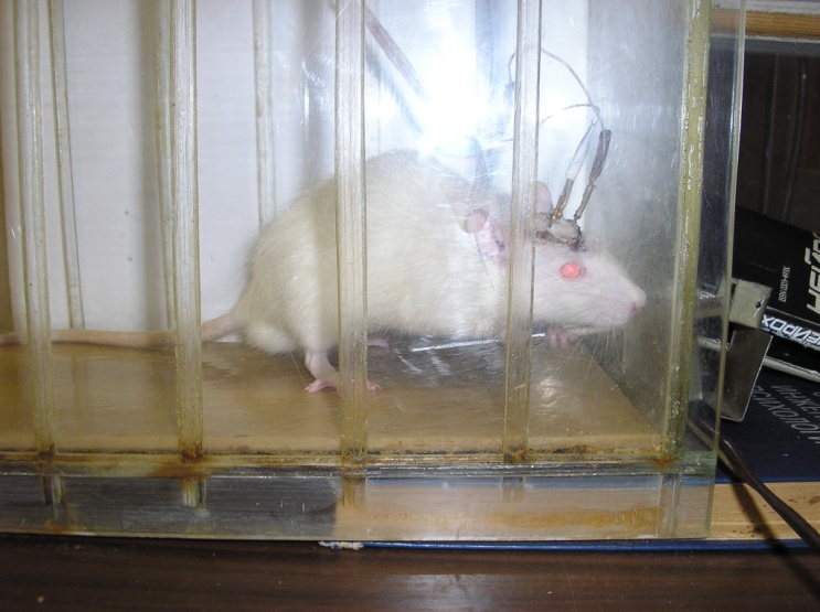 Для воспроизведения самораздражения мозга у крыс использовали классический вариант изучения самостимуляции мозга в виде педальной самостимуляции в камере Скиннера. Через 10 дней после вживления электродов в мозг крыс обучали нажимать на педаль в камере Скиннера для получения электрического раздражения мозга (прямоугольные импульсы отрицательной полярности, длительностью 1 мс, с частотой 100 Гц, в течение 0,4 с, пороговыми значениями тока в режиме «фиксированных пачек»– FR1). Для повторного раздражения животное было вынуждено вновь нажимать на педаль. Анализировали частоту и пороги реакции самостимуляции. Фармакологические препараты вводили на 3-й день эксперимента после стабилизации реакции при использовании фиксированного значения силы тока. Частота нажатий регистрировалась автоматически (рис.5).
