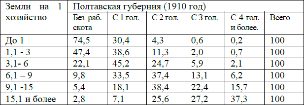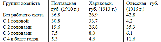 И здесь отчетливо можно проследить более глубокую дифференциацию в степной Одесской губернии, где процент хозяйств безлошадных и многолошадных больше, чем в прочих губерниях. Так, например, процент безлошадных в Одесской губернии был 42,8, в то время как в Полтавской и Черниговской губерниях он равнялся лишь 36,8 и 26,9. Многолошадных хозяйств (с 3 головами и более) в Одесской губернии 17,‑7%, в Полтавской и Харьковской – лишь 12,8 % и 17,6 %.