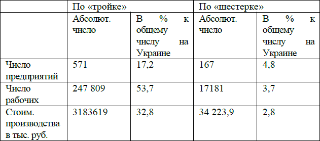 Количество предприятий пищевой промышленности по «тройке» в 21/2 раза меньше количества по «шестерке», рабочих меньше в 6 раз. Таким образом, пищевая промышленность сосредоточилась в районе губерний «Шестерки». Рабочие этих двух отраслей промышленности являлись основной базой пролетариата Украины (83,8 % всего количества). Различные типы рабочих в разных районах предопределяли и то влияние, какое пролетариат оказывал на деревню. В пищевой промышленности Украины, представленной винокуренными и сахарными заводами, работал малоквалифицированный рабочий, больше связанный с деревней, обладающий меньшей революционной выдержкой и традициями, чем горняки и металлисты «тройки». При этом надо принять во внимание, что последние были сконцентрированы на сравнительно небольшом пространстве губерний «тройки». Более того: из 247809 металлистов и горняков «тройки» на долю Екатеринославской губ. приходилось 215496 чел., т. е. свыше 80 % всех украинских горняков и металлистов. Эта же губерния, бывшая во время гражданской войны ядром махновщины, впитала в себя значительное количество рабочих всех специальностей; еще в 1912 году общее количество рабочих здесь равнялось 234 107 чел., что составляло 50,7 % всего украинского пролетариата.