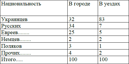 В городах, таким образом, 68 % населения принадлежало иным национальностям, причем больше половины – 59 % – падало на две национальности – русских и евреев; украинцы составляли лишь 1/3 населения городов. Наоборот, в деревне лишь 17 % не принадлежало к украинской национальности.