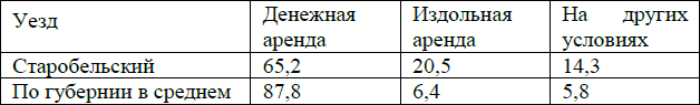 В 1905 году в Старобельском уезде натурально‑крепостпические остатки в арендных отношениях являлись преобладающими. За деньги помещики сдавали 31,8 % площади, за отработки – 2,0 %, из доли – 61,5 %, смешанным способом – 4,7 %. Следующие цифры говорят о том, какие именно помещичьи хозяйства стремились сдавать землю на полукрепостнических условиях: за деньги сдавали 41,7 %, из доли – 46,3 %, смешанным способом – 4,8 %. Совершенно правы были авторы, производившие обследование, когда писали: «Сопоставляя число случаев с площадью данной земли, мы можем сделать заключение, что средний размер площади, приходящейся на одного владельца, больше при издольной и меньше при денежной аренде; и действительно, владелец сдает 115,6 десятины за деньги и 201,6 десятины из доли»20. Крупные владельцы сдавали землю главным образом за натуральные повинности.