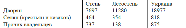 Дворянское, землевладение было господствующим. За истекшие 52 года – до 1914 года – дворянство распродало 217 тыс. десятин, т. е. почти половину принадлежащих ему запасов. Но процесс распродажи земли в разных районах шел с неодинаковой интенсивностью. Так, например, за истекшее время в лесостепи продано было 4625 тыс. дес., т. е. 41 % дворянской земли, а в районе степи 4525 тыс. дес., т. е. 58,3 %. Разница довольно значительная. 80 % проданной земли было куплено крестьянами.