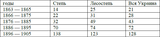 Сельское население за этот период времени возросло в лесостепи всего лишь, – если принять 1861–1865 годы за 100 %, до 224 %, а в степи до 296 %.