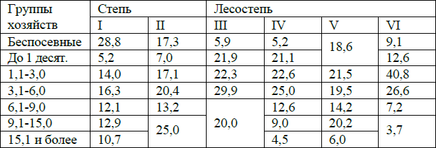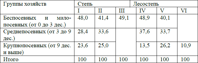 Объединив все группировки в 3 группы24: 1‑я – беспосевные и малопосевные хозяйства, 2‑я – среднепосевные и 3‑я – крупно‑посевные, получим следующую картину дифференциации по посевной площади (в %)25: