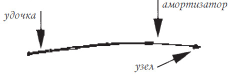 Амортизатор (шляпная резинка 50–60 мм) крепится к кончику удилища за колечко, если оно есть, или приматывается к самому кончику ниткой и пропитывается водостойким клеем.