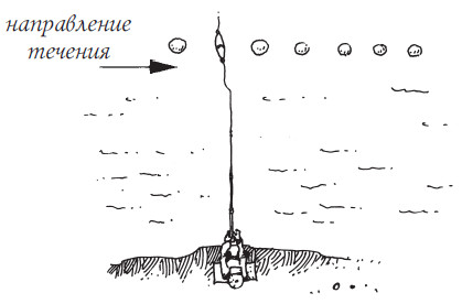 Забрасываем снасть против течения в крайнее положение. Начинаем проводку. Проводка проходит по течению до самого крайнего положения. Постарайтесь запомнить место, где наблюдались частые поклевки (в этом месте дна может быть бугорок, или ямка, или коряжка, задерживающая прикормку).