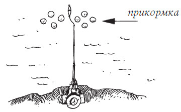 В стоячей воде прикормку распределяют более кучно, в непосредственной близости к поплавку (рис. 5).
