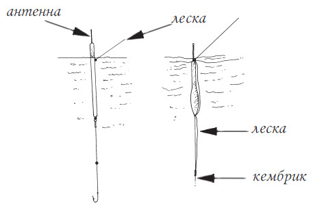 Поплавок следует крепить в 2 точках: в петлю и через кембрик, тогда при потяжке он не заваливается. При торможении или натяжке вы сразу увидите поклевку. Огружается поплавок так: над водой 1,5–2 мм тела и вся антенна, кольцо должно быть под водой на 2-3 мм.