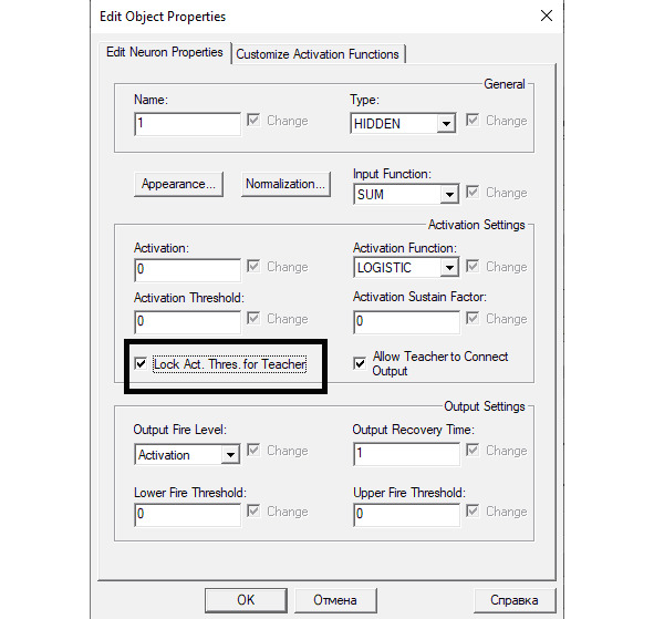 Блокируем нейроны (защищаем их от возможности переобучения) – выделяем все скрытые и все выходные нейроны, на одном из выделенных нейронов открываем Properties в открытом правой кнопкой мыши меню, активируем «Lock Act. Thres. For Teacher»: