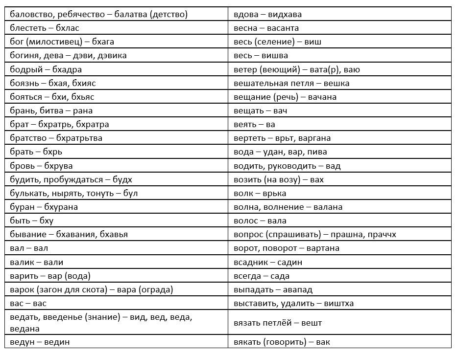 Ну и как завершающую точку в моём кратком отступлении к теме санскрита и русского языка приведу эту сильно сокращённую русско-санскритскую табличку на буквы «Б» и «В»: