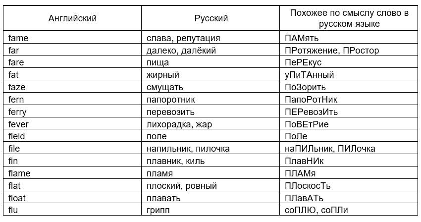 Я взял английские слова, которые содержат букву «F», заменил её на русскую букву «П» и попробовал прочитать эти слова снова. Вот что у меня получилось: