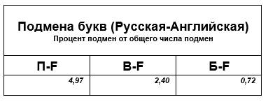 На предыдущей странице мы с вами выяснили, что для английской буквы «C» существует частота подмены на русские буквы. Логично будет переосмыслить наш успех в главе «Закон Раска – Гримма наоборот» и предположить, что подмена буквы «F» тоже не ограничивается русской буквой «П». И мой анализ показал, что это действительно так!