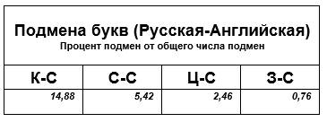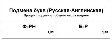 Казалось бы, и у английской «P» должны быть свои товарищи, кроме русской буквы «Б». Но их практически нет. Есть сочетание Р-P, но оно ниже уровня погрешности в 0,5% от всех подмен. Такие примеры есть в словаре, но в этом повествовании я решил их не освещать, чтобы не засорять лишней информацией вам голову.