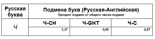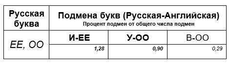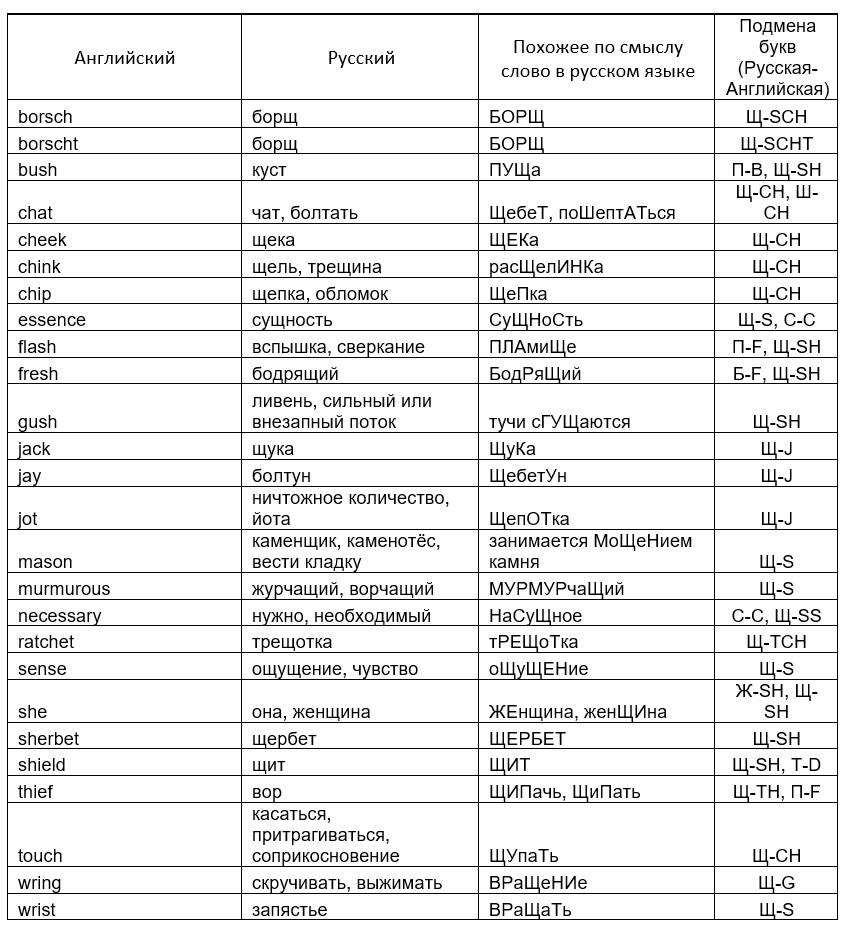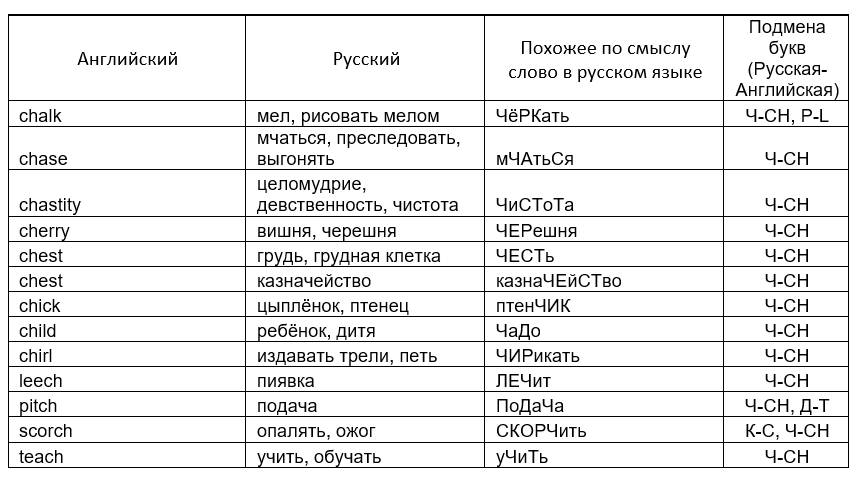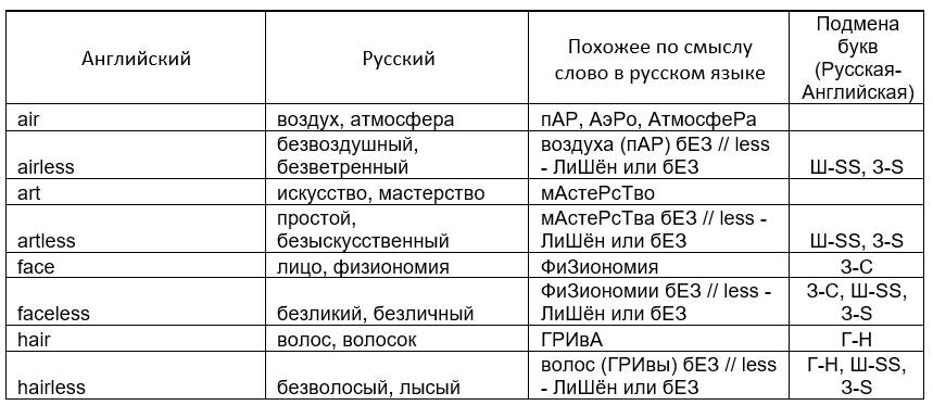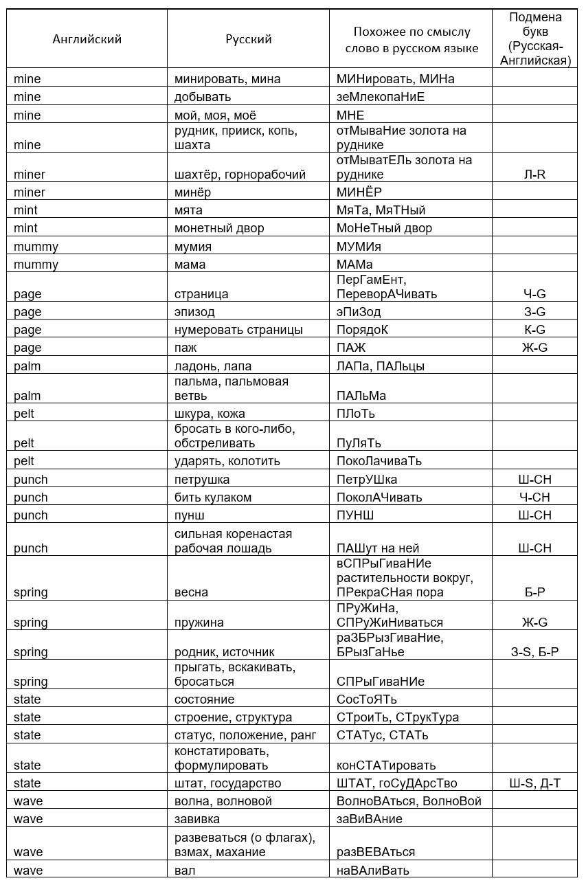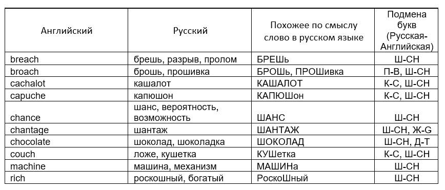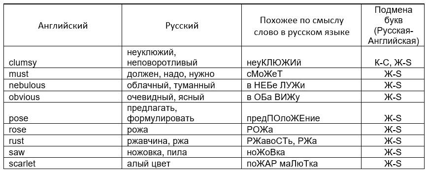Английский | Русский | Похожее по смыслу слово в русском языке // Комментарий автора | Подмена букв (Русская-Английская)