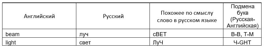 Было бы истинным преступлением, после того, что я рассказал, про слово «light», не упомянуть слово «beam», что по-английски значит «луч». Ведь так похоже, слово «BEaM» на слово «сВЕТ».