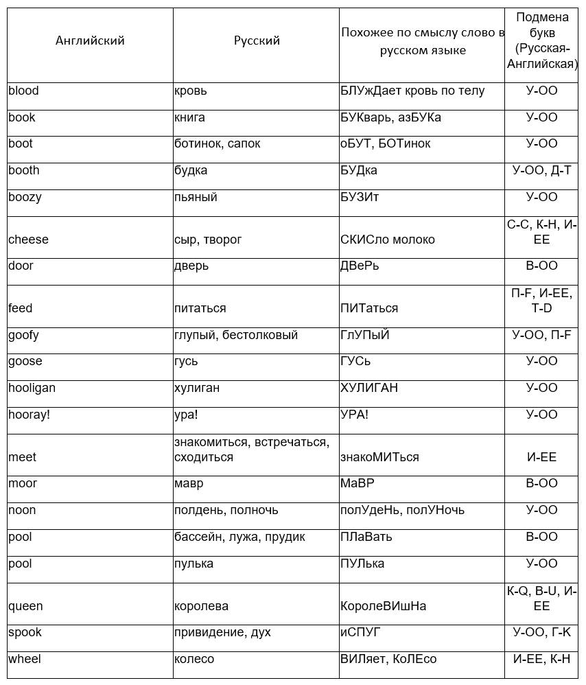 Хорошим подспорьем в поиске смысла английских слов являются сдвоенные английские гласные. Они используются во многих популярных словах. Вот несколько примеров: