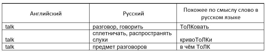 Некоторые слова в этом столбце я и вовсе выдумал. Но не для того, чтобы ввести вас в заблуждение, а как раз наоборот. Таким образом я показываю какое оно могло быть, то слово, из которого получилось современное русское слово и современное английское: