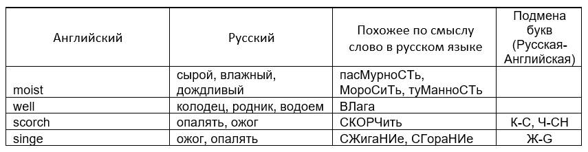 Та часть слов, где перевод не дословный, а смысловой, работает по тому же принципу, что и описание слова «artist» в предыдущей теме. Это близкие по смыслу значения. Мы говорим о воде, значит отгадку следует искать в математическом множестве «вода», это может быть мокрое, сырое, влажное. Говорим о огне, значит ищем отгадку в множестве «огонь». И так далее: