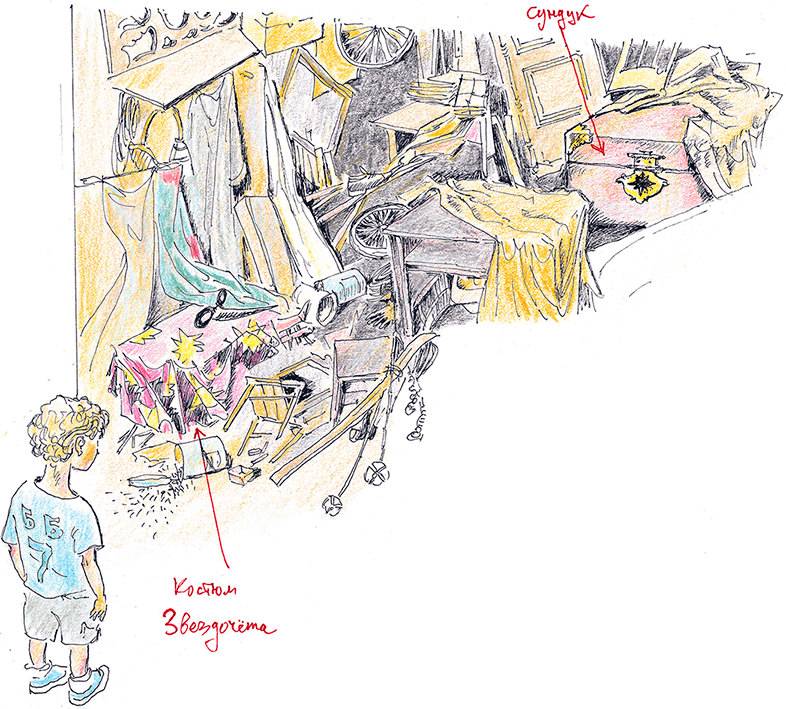 Тёма с тоской смотрел на беспорядок в чулане – пыльные, старые вещи, свалившиеся с полок прошлой ночью, когда он вытаскивал костюм Звездочёта… В маленькое окошко под потолком заглянуло солнце, и в углу что-то блеснуло – что-то, чего Тёма раньше в чулане не видел. Он отодвинул в сторону старые платья и пальто, отшвырнул сломанные стулья и детские лыжи с ботинками, полез в угол.
