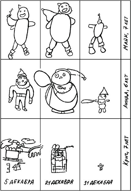Психологи одного направления, известного в психологии под названием «New Look» («Новый взгляд»), охарактеризовали потребности, установки и желания как «личностные факторы» познания и попытались через изучение влияния этих личностных факторов на познавательные процессы человека судить об его личности[8]. Например, представители «New Look» провели следующий весьма иллюстративный эксперимент, убедительно демонстрирующий роль личностных факторов в процессе познания. Они попросили детей нарисовать изображение Санта-Клауса (5 декабря, 21 декабря, 31 декабря. Оказалось, что чем ближе был праздник, тем больше места на карточке занимал Санта-Клаус, тем больше набухал мешок с подарками у него за плечами. После встречи с Санта-Клаусом его изображение на карточке резко уменьшилось (рис. 1).