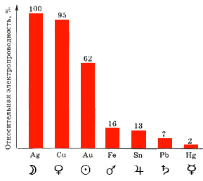 Первая группа состоит из семи сочетаний по кругу между соседними планетами. Это "халдейский порядок" небесных тел, основанный на возрастании скорости по отношению к "неподвижным" звездам. Луна движется быстрее остальных, далее следуют Меркурий, Венера, Солнце, Марс, Юпитер и Сатурн. Если этим планетам сопоставить металлы, как это делалось в древности, то можно заменить, что полученный ряд, за единственным исключением, соответствует ряду электропроводности металлов: