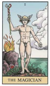 Маг – эта карта начинает первый цикл Серы, состоящий из семи карт. На карте изображен Гермес, правой рукой с жезлом указывающий на небо, а левой – на землю. Этот жест означает известное алхимическое изречение "И то, что вверху, аналогично тому, что находится внизу, чтобы осуществить чудеса единой вещи", открывающее путь к раю на земле. У ног Гермеса растут алая и белая розы, символы мужского и женского начал. Гермес изображен в окружении символов четырех стихий, слева Огонь и Земля, а справа Воздух и Вода. Таким образом, напротив друг друга оказываются враждующие стихии, образуя крест творения. Воздух сушит землю, превращая её в "прах земной", а вода гасит огонь, превращаясь в пар. Из этих новых субстанций и происходит творение: "И создал Господь Бог человека из праха земного, и вдунул в лице его дыхание жизни, и стал человек душею живою" (Быт. 2, 7). Кроме того, данный крест наглядно показывает, как из первичных качеств формируются первоэлементы. Движение по часовой стрелки по кресту творения символизирует уплотнение материи (Огонь-Воздух-Вода-Земля), этот процесс алхимики называли Coagulation, а обратное движение в сторону разряжения материи – Solution. Причем оба этих процесса протекают в природе одновременно2 и такое одновременное вращение креста творения в обоих направлениях называлось Solve et coagula.