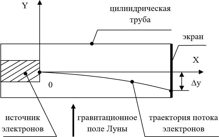 Рассмотрим теперь кинематику эксперимента. Если смотреть на установку со стороны Луны, то наш опыт будет точь-в-точь похож на школьную задачку о бросании камня вдоль горизонта и его падении на Землю в потенциальном гравитационном поле Земли. Только у нас вместо камня будет электрон, а бросать мы его будем в потенциальном гравитационном поле Луны. Сначала смотрим со стороны Луны в горизонтальную плоскость, которая касается поверхности Земли, а вернее – касается пика горки, где расположена наша установка. Источник электронов находится от нас (со стороны Луны) в левом торце цилиндра трубы, электрон летит слева-направо к электрону-анализатору. По ходу своего движения к экрану электрон будет отклоняться в нашу сторону (в сторону Луны). А теперь посмотрим на ту же картинку горизонтальной плоскости сверху. Луна окажется внизу картинки, а электрон летит слева-направо (рис. 20.11).
