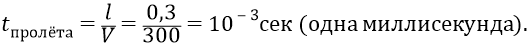 И поскольку время пролёта электрона в цилиндре установки составит (в первом приближении) величину (для активной дистанции электрона от источника до экрана 6 м,