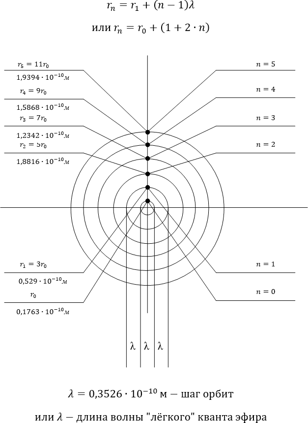 На длине этого диаметра, как и на каждом шаге новой орбиты, квант «лёгкого» эфира делает в пространстве один полный оборот вокруг оси своей конструкции, входя в конце каждого такого шага (на уровне очередной стационарной орбиты) в пространственный резонанс с конструкцией орбитального электрона, кружащего по этой орбите.