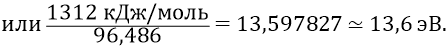 Далее мы обратимся не к физике, но к химии. Ещё задолго до атомной теории физиков другие учёные, химики, уже добыли из своих многочисленных опытов, причём добыли разными методами исследований, такую важнейшую характеристику для каждого атома периодической системы Менделеева как «энергия ионизации атома». В науке химии она исчисляется в единицах – кДж/моль («килоджоуль на моль»). Для одноэлектронного водорода величина этой характеристики равна: