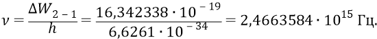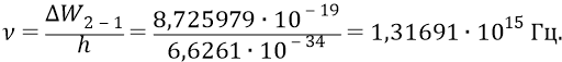 Далее по формуле Планка находим частоту, излучаемую атомом при переходе 2–1: