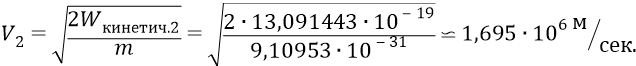 По ходу дела, в отличие от физиков, в нашей квантовой физике мы можем найти величину линейной скорости электрона на второй атомной орбите (как и на всех других):