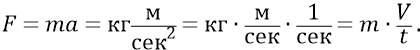 Здесь и спрятаны те самые две наши «единицы» времени, о которых мы говорили чуть выше: одна единица «секунды» принадлежит скорости V и попадает в знаменатель выражения для силы – как