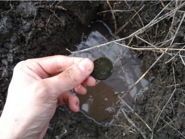 Затем мы перешли речку по стволу дерева. Камрад соскользнул и намочил ноги, набрав воду в сапоги. Я же перебрался благополучно. Оказывается, в этой речке есть бобры – видели их погрызы. Также в небе видели очень низко летящих диких гусей и высоко – журавлей, которые образовали клин в виде буквы А. Её остриё указало мне направление, где копать и правда – именно в той стороне я и нашёл свою Первую монетку, отойдя 15 шагов от старой яблони по направлению к реке. Выкопать пришлось большую яму. Монетка лежала в слое красного и жёлтого песка с черепками. Ямка быстро заполнялась водой…