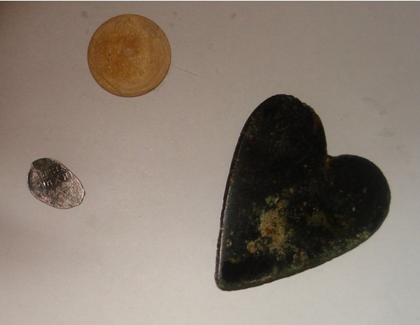 Метрах в пяти от дороги меня остановил чёткий сигнал, и я начал увлечённо рыть, когда подошёл неизвестный камрад, который выдал ценную информацию о данном месте. Он сказал, что за день насобирал аж целых 6 какаликов, ходя за трактором. Я подумал, что это мало для такого поля. Посмотрев на прибор, камрад сказал, что я копаю железо и удалился, сообщив что он здесь второй раз. Я докопал сигнал и к удивлению своему обнаружил в земле сердце из тёмного металла. На задней его части располагался крючок. Железная накладка, – подумал я. И ещё пронеслась мысль, что это за знак такой – может, не везёт в копе, повезёт в любви?