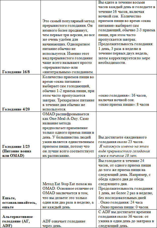 Обычно прерывистое голодание, как общий термин, который включает в себя следующее виды голодания: