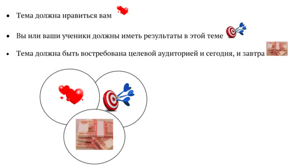 Пересечение трёх областей «нравится-получается-востребовано» указывает на правильный выбор темы и приносит основные доходы.