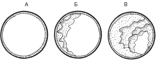 Во время положительных эмоций сосуды расширяются, и кровь начинает струиться по ним свободно, хорошо орошая все органы и ткани (рис. 1, Б). Вполне очевидно, что положительные или отрицательные эмоции соответственно тормозят или ускоряют развитие атеросклероза. Так, при длительных непреодоленных стрессах в крови повышается уровень катехоламинов, возрастает уровень глюкозы и холестерина. Все это способствует образованию атеросклеротических бляшек. Самое же пагубное заключается в том, что после сорока лет начинает деградировать сосудистая стенка, эластичность которой нарушается.