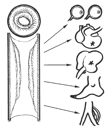 Казалось бы, пустяк. Какая нам разница, какая у наших сосудов стенка: эластичная или не очень? Но нет, от состояния сосудистой стенки зависит ритм сосудов, скорость распространения по ним пульсовой волны. Когда сосуды теряют упругость, то сердцу приходится толкать кровь с увеличенной мощностью. В результате повышается величина артериального давления. Сосуды же словно деревенеют. Они становятся подобными водопроводным трубам. В них начинают накапливаться отложения холестерина, а затем и кальция. Все это сужает просвет сосудов и значительно сокращает кровоснабжение разных органов и тканей (рис. 2). В результате возникает ишемия (голодание). Кислород, питательные и строительные вещества поступают к клеткам с перебоями. С другой стороны, замедляется вывод отработанных веществ – токсинов и шлаков. Все это приводит к самоотравлению организма.