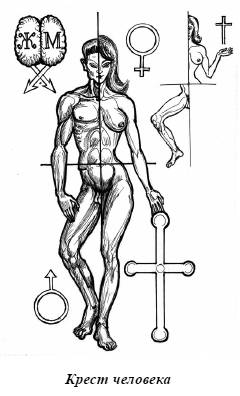 Таким образом, в организме человека наблюдается тождество правой и левой половинок, низа и верха. Можно сказать, что организм человека имеет четвертичную структуру. Он состоит из четвертинок, каждая из которых имеет свою собственную конечность одну гонаду (половую железу) или половинку мозга. Если провести поверх обнаженного человеческого тела ручкой разделительную линию, отделяющую верх от низа и правую часть от левой, то перекрестие этих линий придется на район пупа. (Пуп является также географическим центром человеческой фигуры, здесь крепилась пуповина, когда мы были в утробе матери). У нас получится крест, состоящий из линий. Вероятно, правы были древние люди, изображая абстрактный крест, и мысля под его изображением человека. Надо заметить, что крест весьма древний символ. Изображение креста высечено на груди каменной фигуры царя Шашми-Адада из ассирийского города Кальху. На древнеегипетских рельефах также имеются изображения креста. У индейцев Америки крест являлся священным символом, задолго до путешествия Колумба и проникновения в Новый Свет христианства.