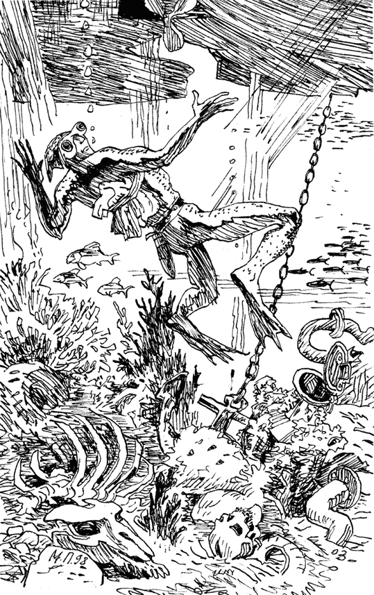 В нескольких местах на дне ему встретились трупы людей и скелеты животных. У одного трупа был расколот череп, а на шее виднелась веревка с привязанным камнем. Здесь было погребено чье-то преступление. Ихтиандр спешил скорее выплыть из этих мрачных мест.