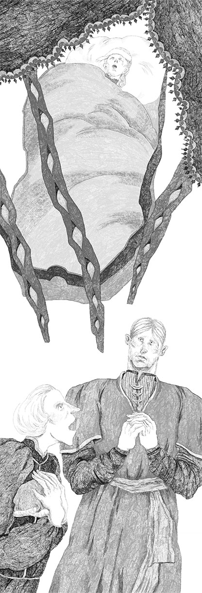 И человек, приняв образ, и пошел на двор Фрола Скобеева. И усмотрил Фрол Скобеев, что пришед тот же человек, сказал жене своей: «Встань, Аннушка!» И она встала, и села вместе со Фролом Скобеевым. И человек тот вошел в покои, и отдает образ Фролу Скобееву. Приняв образ, поставил где надлежит и сказал тому человеку: «Таково-то родителское благословение! И заочно намерены благословить, и Бог дал Аннушке лехче. Слава Богу, здрава!» И сказал Фрол Скобеев: «Тако ж и Аннушка благодарит батюшку и матушку за их родителскую милость». И человек пришел к господину своему и объявил об отдани образа, и о здрави Аннушки, и о благодарени их, и пошел в показанное свое место.