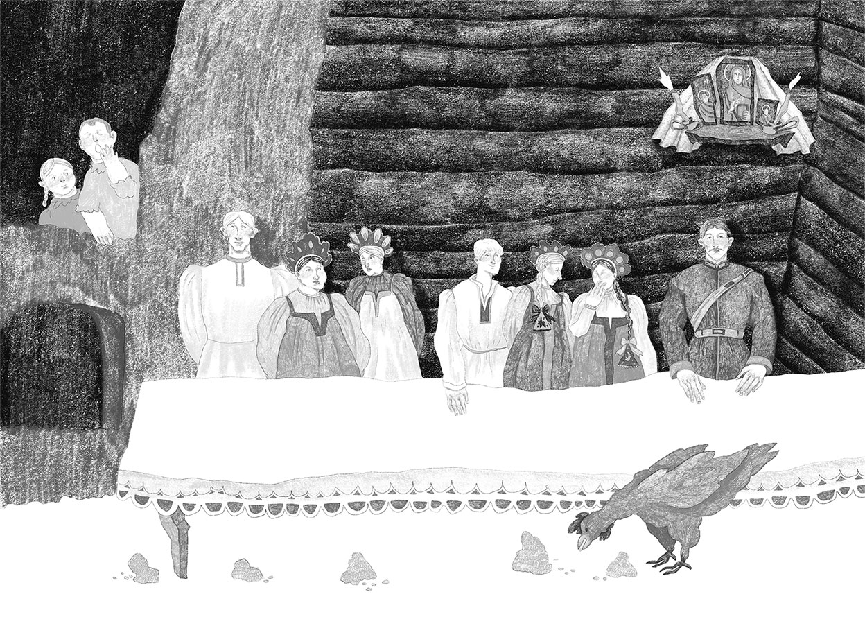 Молодцы, в пестрядинных или ситцевых рубашках с косыми галунными воротками и в суконных кафтанах, увивались около или, собравшись в кучки, пересмехались, щелкали орешки, и один из самых любезных, сдвинув набекрень шапку, бренчал на балалайке «Из-под дубу, из-под вязу». Седобородый отец хозяина лежал на печи, обратясь лицом к нам, и, качая головой, глядел на игры молодежи; для рам картины, с полатей выглядывали две или три живописные детские головки, которые, склонясь на руки и зевая, посматривали вниз. Гаданья на Новый год пошли обычной своей чередою. Петух, пущенный в круг, по обводу которого насыпаны были именные кучки овса и ячменя с зарытыми в них кольцами, удостоив из которой-нибудь клюнуть, возвещал неминуемую свадьбу для гадателя или загадчицы… Накрыв блюдом чашу, в которой лежали кусочки с наговорным хлебом, уголья, значения коих я никак не мог добиться, и перстни да кольца девушек, все принялись за подблюдные песни, эту лотерею судьбы и ее приговоров. Я грустно слушал звучные напевы, коим вторили в лад потрясаемые жеребьи в чаше.