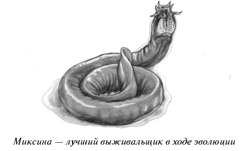 Быть бесчелюстной рыбой с зубами весьма приятно в мире, населенном исключительно другими бесчелюстными рыбами, трилобитами и мягкими морскими червями. Это даже приемлемо в мире, где у рыб есть челюсти, но нет зубов в ротовой полости[5]. Однако отнюдь не приятно существовать в мире, наполненном акулами. Когда наступил девонский период палеозойской эры (или эпоха рыб, которая была около 400 миллионов лет назад), жизнь бесчелюстных рыб стала все сильнее походить на борьбу за выживание. Большинство из них не пережили девонское массовое вымирание. До наших дней дожили около 120 видов упрямых и стойких бесчелюстных миксин и миног.