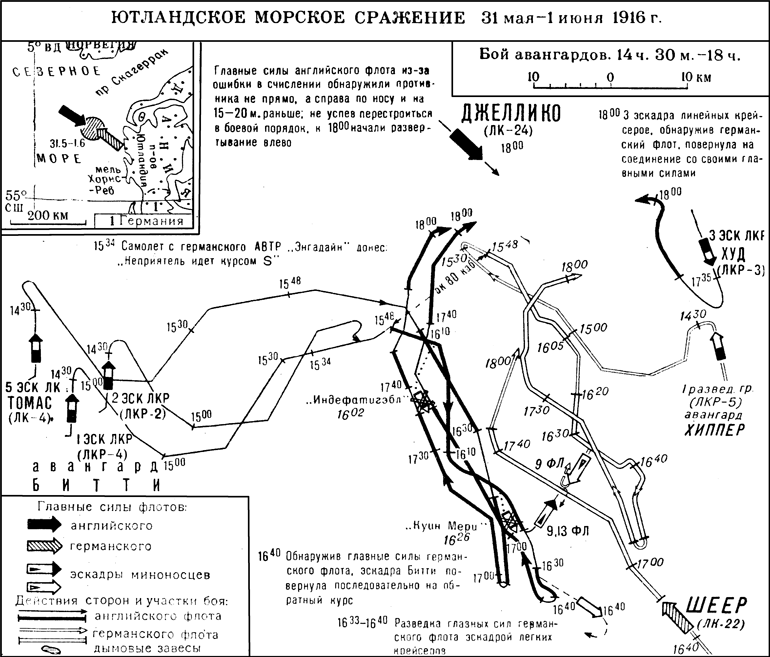 Любопытно отметить, что флагман Джеллико «Айрон Дьюк» принял сигнал «Галатеи» в 14.18, а вот флагман Битти «Лайон», которому оно, собственно, и адресовалось, только в 14.20. В 14.26 коммодор Александер-Синклер повернул крейсера «Галатея» и «Фаэтон» на NO, чтобы атаковать германские эсминцы, а Мадлунг пошел им на помощь. В 14.28 «Галатея» открыла огонь по немецким миноносцам, которые поспешно отошли, не получив попаданий. Примчавшийся «Эльбинг» ответил на огонь «Галатеи» с дистанции 15 000 ярдов, однако по странной случайности первый германский снаряд, попавший в британский крейсер, не взорвался. Так началась Ютландская битва, причем оба главнокомандующих не подозревали, что встретились с главными силами противника.