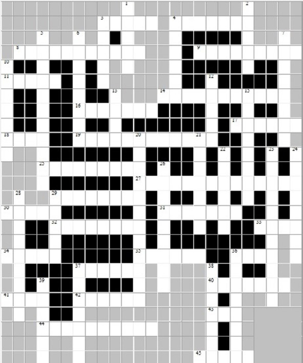 По горизонтали: 3. Добыча диких зверей и птиц ради пушнины, мяса и др. 4. Неукрепленное поселение охотников и рыболовов каменного века. 8. Ископаемый человек современного вида эпохи позднего палеолита. 9. Пещера в Испании, в которой была найдена настенная живопись первобытных людей. 11. Парнокопытное животное. Объект охоты первобытных людей. 14. Добыча рыбы. 16. Ущелье в Восточной Африке, в котором в середине XX в. были найдены орудия труда и кости «человека умелого». 17. Гладкий округлый камень 18. Орудие труда, используемое при изготовлении одежды 19. Наука о происхождении и развитии человека. 25. Художественное творчество. 27. Одно из первых занятий человека, наряду с охотой и рыболовством. 29. Древний каменный век 30. Колющее или метательное оружие – древко с каменным, костяным или металлическим наконечником. 31. Вера в существование богов, сверхъестественных сил и загробного мира. 32. Испанский археолог, открывший пещерную живопись. 33. Небольшое животное, предмет охоты первобытных людей. 34. Многофункциональный режущий инструмент. 35. Режущий инструмент для сверления. 36. Способ выражения и обозначения количества чего-либо. 37. Огромный слон с длинной рыжей шерстью, хорошо переносивший холодный климат. Был современником и объектом охоты человека каменного века. Вымер в результате изменения климата. 40. Кремневое орудие, использовавшееся первобытными людьми для обработки шкур. 41. Орудие труда, внешне похожее на толстую иглу. 42. Многолетнее растение с одревесневшим главным стеблем (стволом). 43. Группа родственников, ведущих происхождение от общего предка, носящих общее родовое имя. 44. Наука, изучающая историю древних народов по сохранившимся вещественным памятникам. 45. Действия и слова, якобы обладающие чудодейственными свойствами.