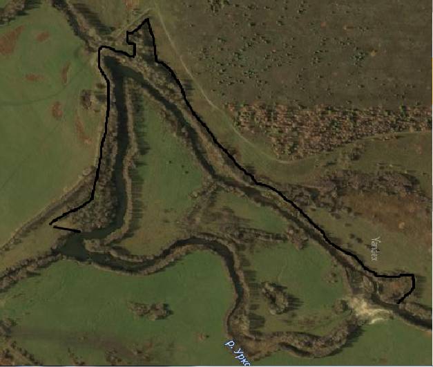 Изображение «барсука» является как бы двухконтурным, поскольку линия русла в районе «головы» и «холки» животного не совпадает с линией прирусловой растительности. По нашему мнению, это обусловлено произошедшем в прошлом смещением русла, о чем свидетельствует прорезывание рекой растительного «каре», расположенного в районе «груди» животного. Некогда это «каре», несомненно, было единым образованием, целиком расположенным на левом берегу. Возможно, изменение положения русла было обусловлено мелиоративными работами, проводившимися в этом районе в середине ХХ века. «Первичной» линией, формирующей «голову» животного, вероятно, следует считать именно линию прирусловой растительности повторяющей контуры древнего русла. В этом случае общий абрис «фигуры» приобретает более массивный характер и начинает напоминать скорее ревущего медведя (Рис. 21 и Снимок 22).