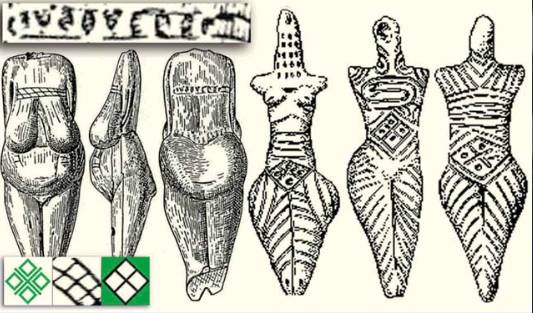 Кроме того, в пределах этих геоглифических комплексов нами было обнаружено несколько участков, на которых можно разглядеть множество рунических символов, в некоторых случаях складывающихся в строчки. Символы имеют размеры от 3 до 10 метров. Они различимы гораздо хуже, чем зооморфные изображения. Приводить их на малоразмерной иллюстрации бессмысленно, поэтому мы приводим их в Приложениях (Снимок 15) несколько увеличив контрастность изображения. В этой связи считаем возможным напомнить, что самый ранний из найденных письменных текстов, датируемый 42 тысячелетием до н.э., находится именно на статуэтке богини Мокоши «Из Костенок», найденной в Воронежской области (Рисунок 28).