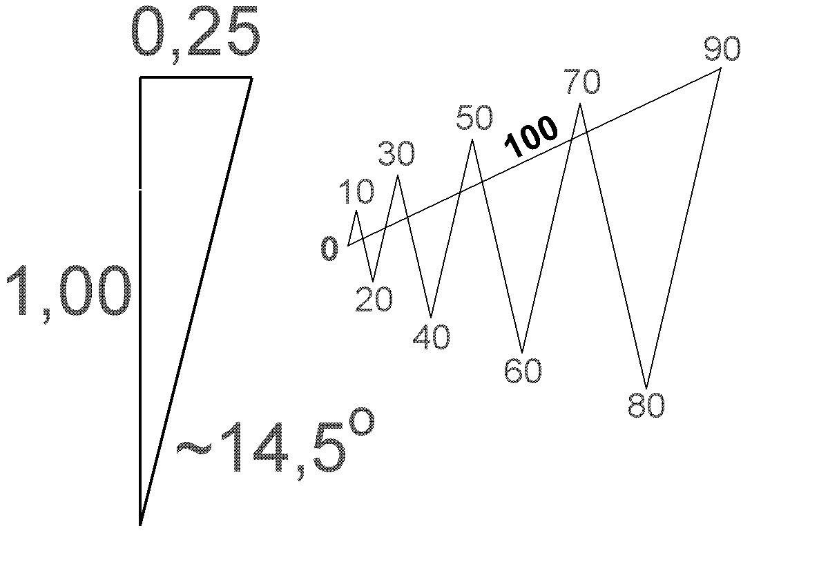 – Смотри, нам велено зигзагом север-юг-север-юг и т.д. с небольшим уклонением к востоку пролететь на первом отрезке 10 км, на втором 20 и так далее, всё больше и больше, до 90 км на девятом отрезке. А потом десятый отрезок откуда-то с востока куда-то на запад – это нам задали определить в качестве части задания, откуда и в каком направлении лететь, – должен привести нас в точку старта. Причём этот отрезок должен быть обязательно длиной 100 км. Это расстояние от аэродрома мы должны набрать как раз за счёт постепенного уклонения к востоку. Тут возможны варианты, но я выбрал для скорости самый простой, с одним и тем же углом между отрезками маршрута и направлением на север или на юг, смотря куда летим. Тут простая геометрическая задача, из которой получается, что синус этого угла равен 0,25. То есть угол бери по компасу чуть меньше 14,5° и не ошибёшься. Точнее можно было бы 14,47°, но такой точности от нас не потребуют.