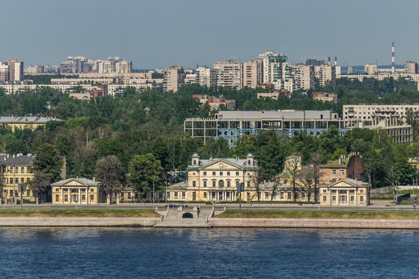 Свердловская набережная. Пара сфинксов на крыше грота. На заднем плане Смольный собор